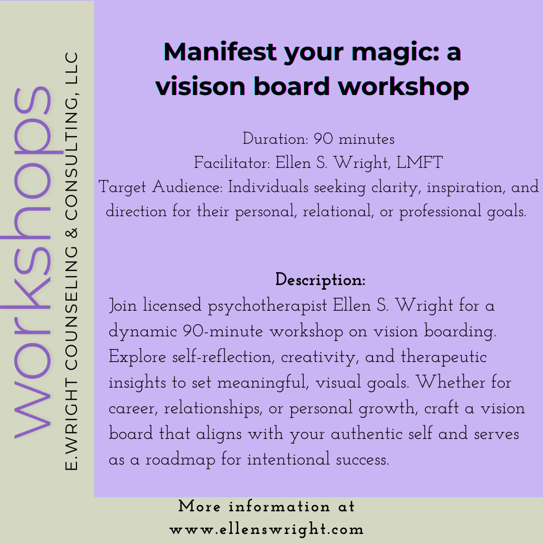 Join licensed psychotherapist Ellen S. Wright for a 90-minute vision board workshop on January 11, 2025. Participants will learn to visualize and set meaningful goals in their careers, relationships, and personal lives. No artistic skills needed. Enroll for $20, with two sessions available to accommodate different time zones. … More Manifest your magic: A Vision board Workshop!